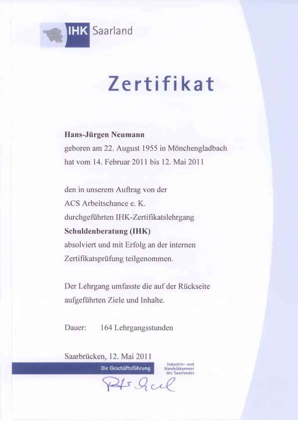 Die mehrmonatige fundierte Zusatzausbildung durch die IHK Saarland "Schuldenberatung IHK ", mit bestandener Zertifikatprüfung unterstreicht unsere Kompetenz und berechtigt uns auch darauf hinzuweisen.